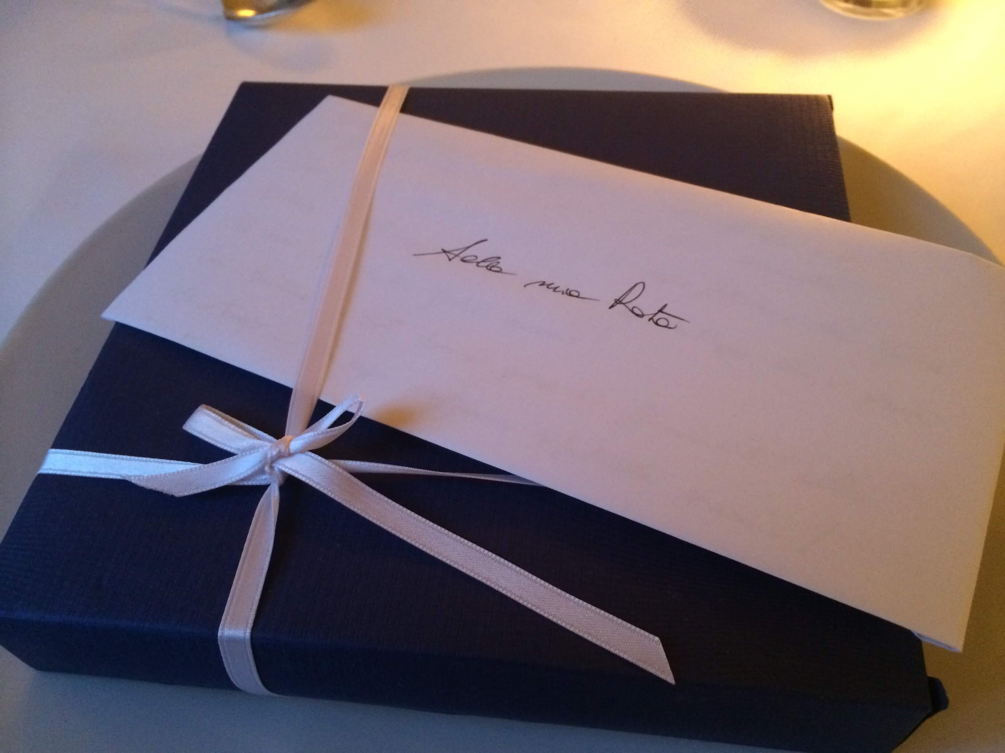 Tutto era andato alla perfezione, ma Pato aveva ancora una carta da giocare per stupirmi. Mentre attendevamo il dolce, il cameriere si avvicinò al nostro tavolo con due piatti elegantemente coperti da campane in acciaio. Con un gesto teatrale, sollevò il “coperchio” rivelando il mio regalo di compleanno. Un’ondata di emozione mi travolse!