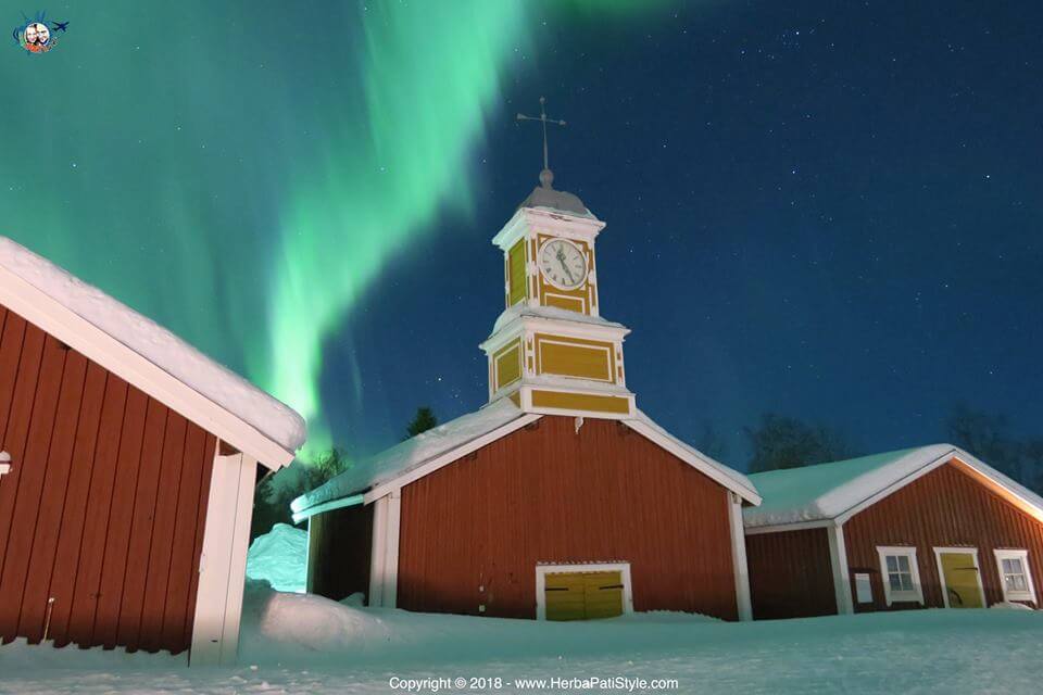 Questa volta, comunque, siamo stati davvero molto fortunati… una notte il fenomeno è stato così potente che siamo riusciti a fotografarla proprio dal centro del paesino di Kukkolaforsen… nonostante l’illuminazione!
